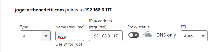 * **Proxy Status:** Deixe como DNS Only (Nuvem cinza)