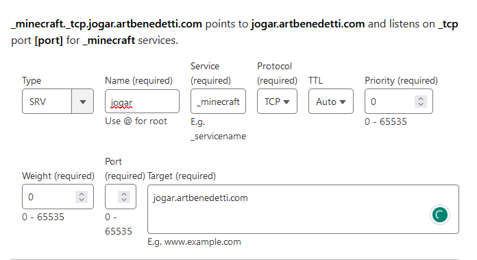Os dois registros estão com o mesmo nome neste exemplo, mas não haverá problema nesse caso por serem de tipos diferentes, os jogadores tanto Bedrock quanto java poderão entrar no servidor usando o mesmo nome de domínio.