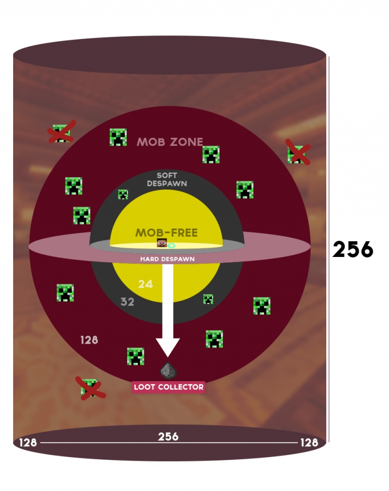 Abaixo está um gráfico de como o spawn de mobs funciona em volta de um jogador. Os valores indicados são feitos com base no padrão Vanilla/Paper