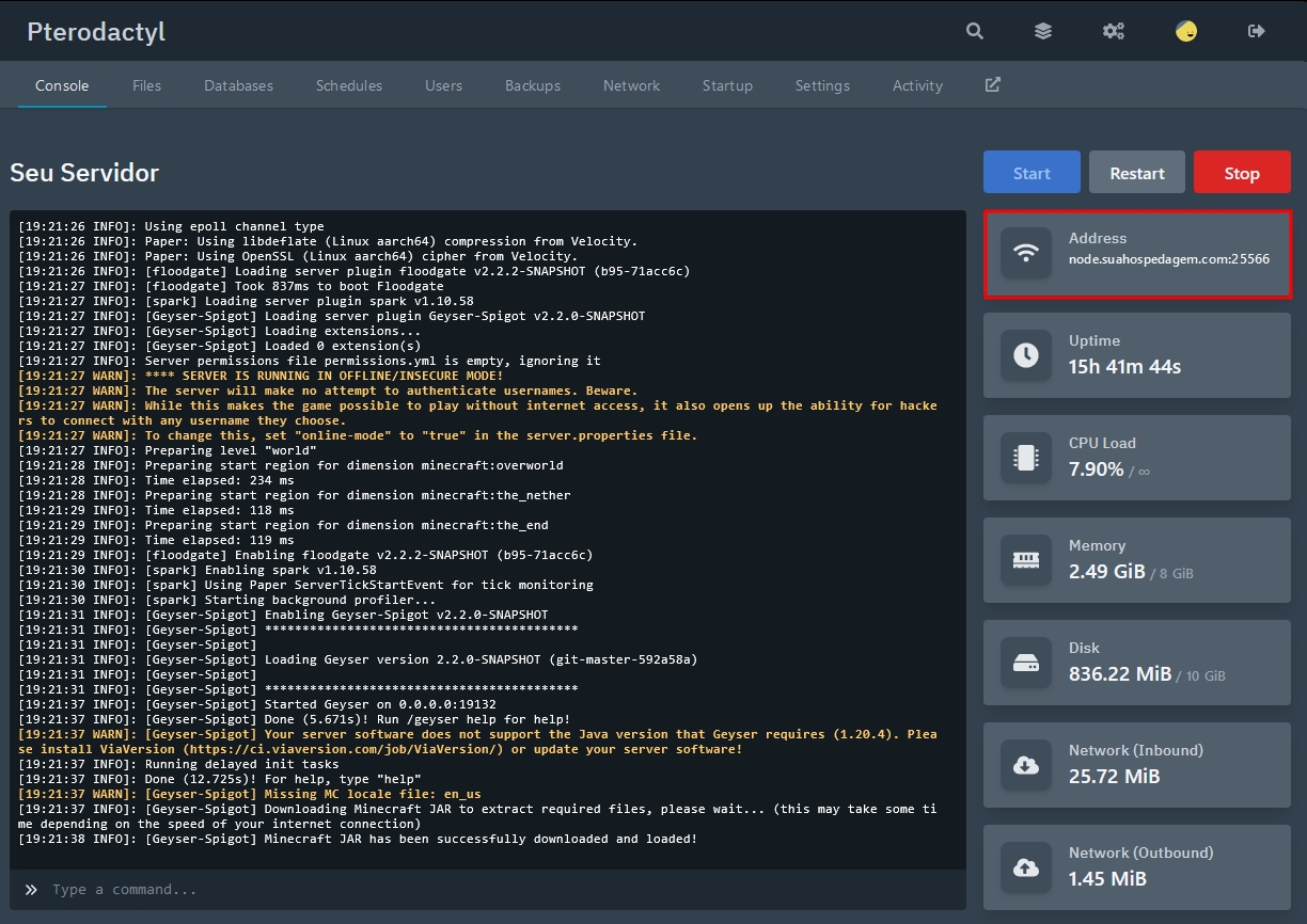 Muitas vezes o IPV4 do seu servidor, juntamente com a porta, estará no painel da hospedagem. Algumas hospedagens utilizam painéis diferentes, outras com temas diferentes, mas sempre será o endereço que precisará para entrar no servidor, como no exemplo abaixo: